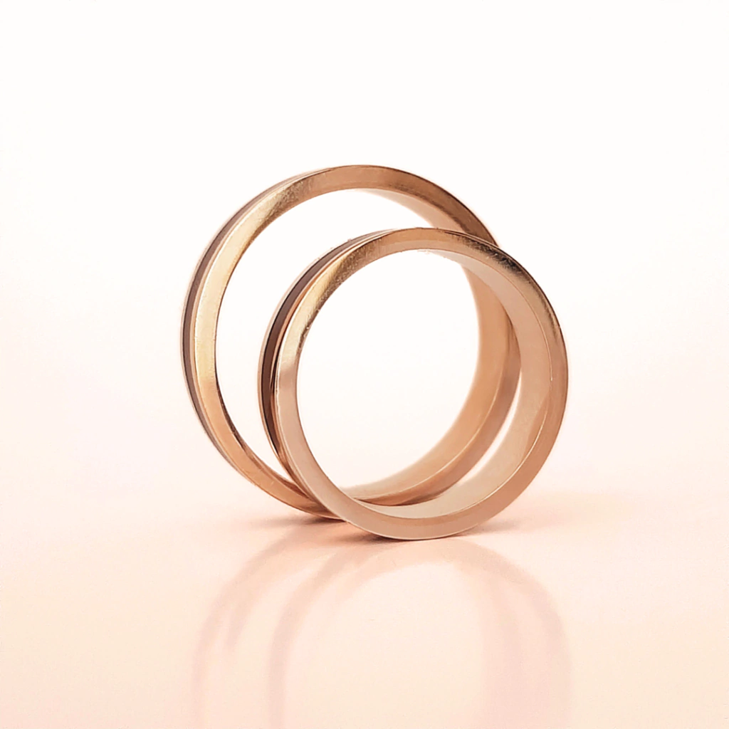 Hacemos tus alianzas de casamiento en Oro rosa 18k y madera de ébano, realizadas a medida por manos especializadas y experimentadas en las labores artesanales.