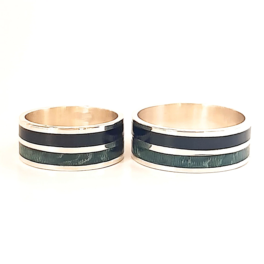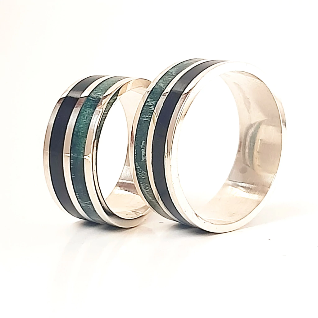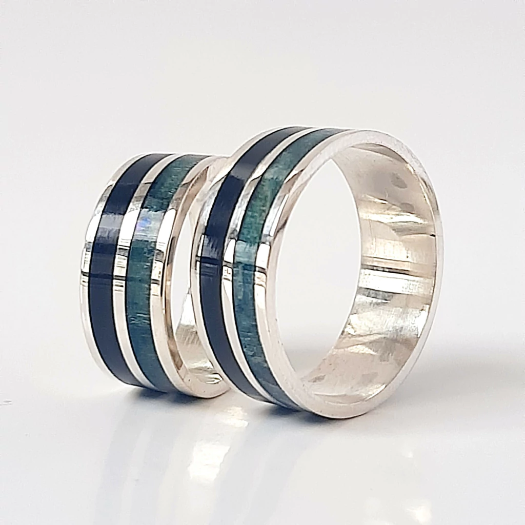 CARACTERÍSTICAS SET ALIANZAS 8 MM DE PLATA 925 CON MADERA DE ÉBANO Y MADERA TURQUESA. INCLUYE ESTUCHE